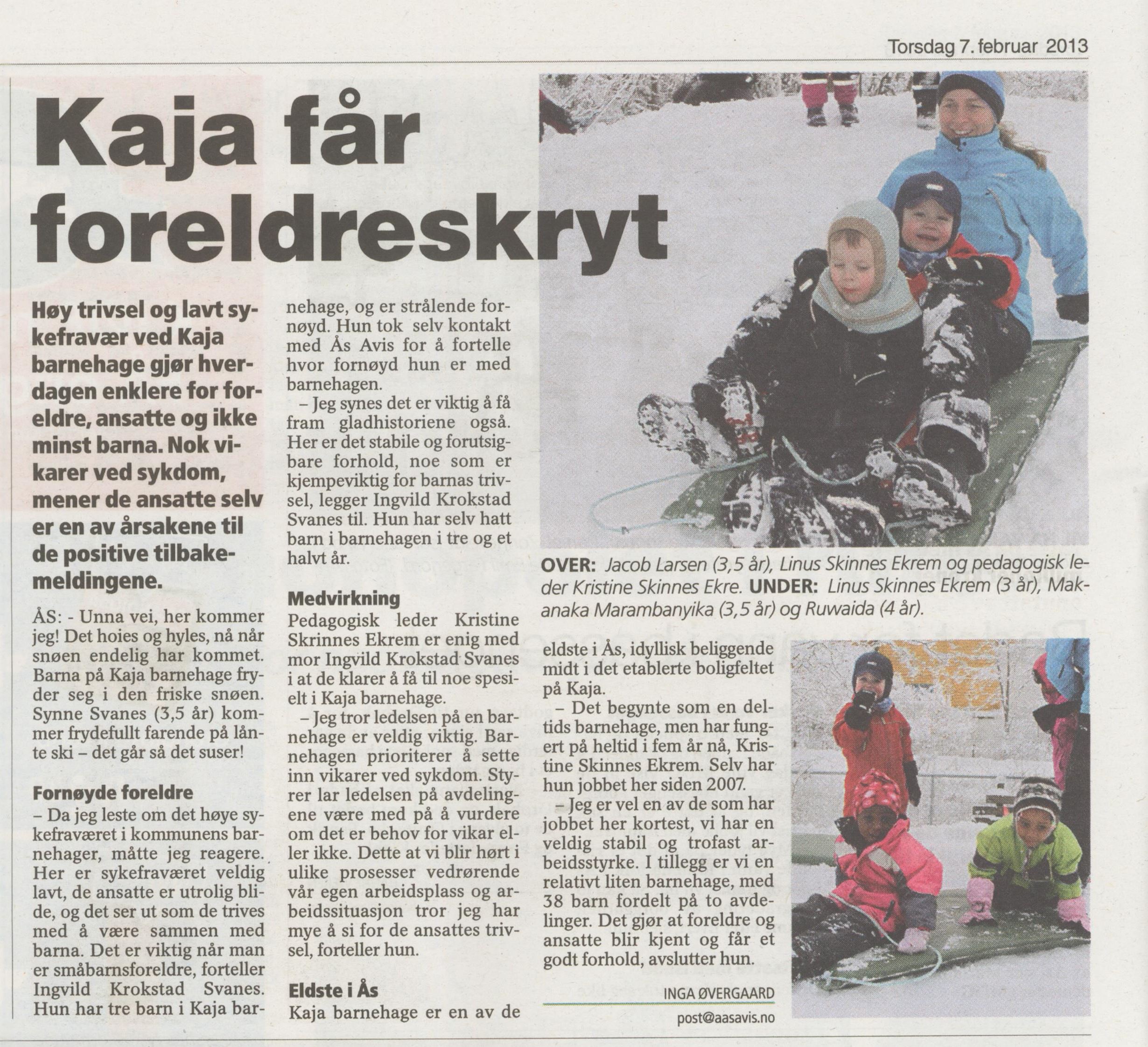 7. februar hadde Ås avis en artikkel om det lave sykefraværet i Kaja barnehage.